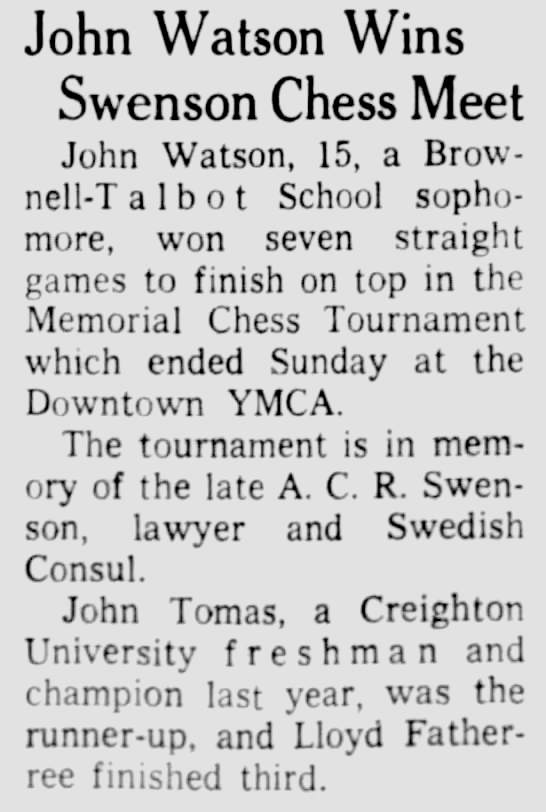 John Watson of Omaha 15-year-old junior at Brownell Hall-Talbot School won the Nebraska Speed chess championship Sunday at the Downtown YMCA.